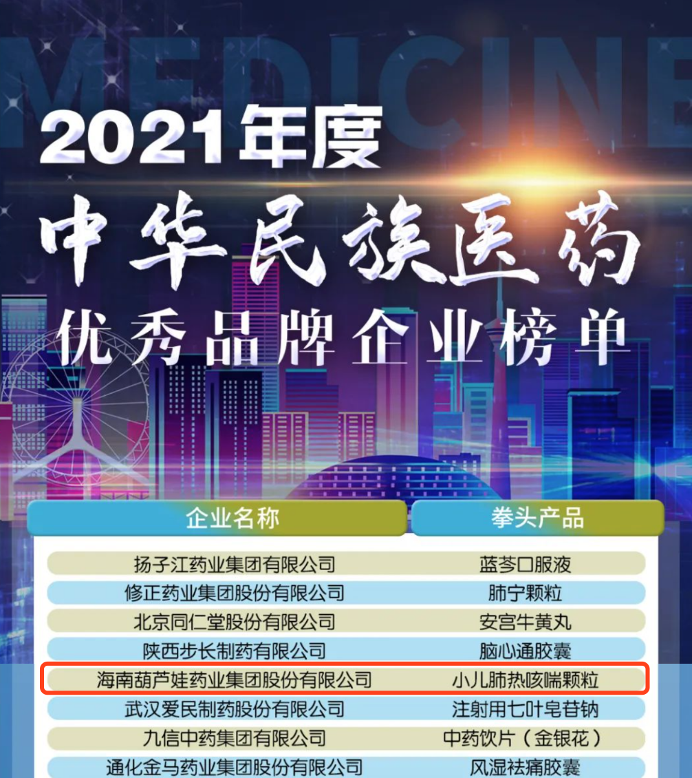 12月29日,全国工商联医药业商会发布了“2021年度中华民族医药优秀品牌企业榜单”,BG视讯药业集团凭借黄金单品小儿肺热咳喘颗粒(4克)实力登榜。
